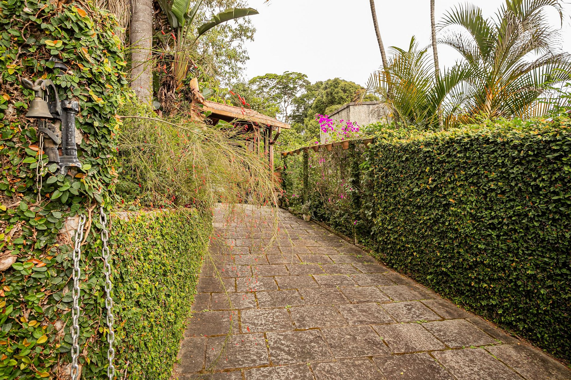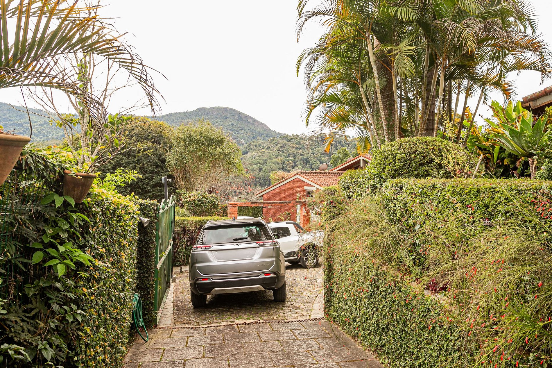 Logo na chegada, um caminho ladeado por jardins floridos e paredes vivas de hera conduz até o portão. O verde está por toda parte, e a vista das montanhas começa a se revelar ainda na entrada, anunciando o clima de paz que define a experiência.