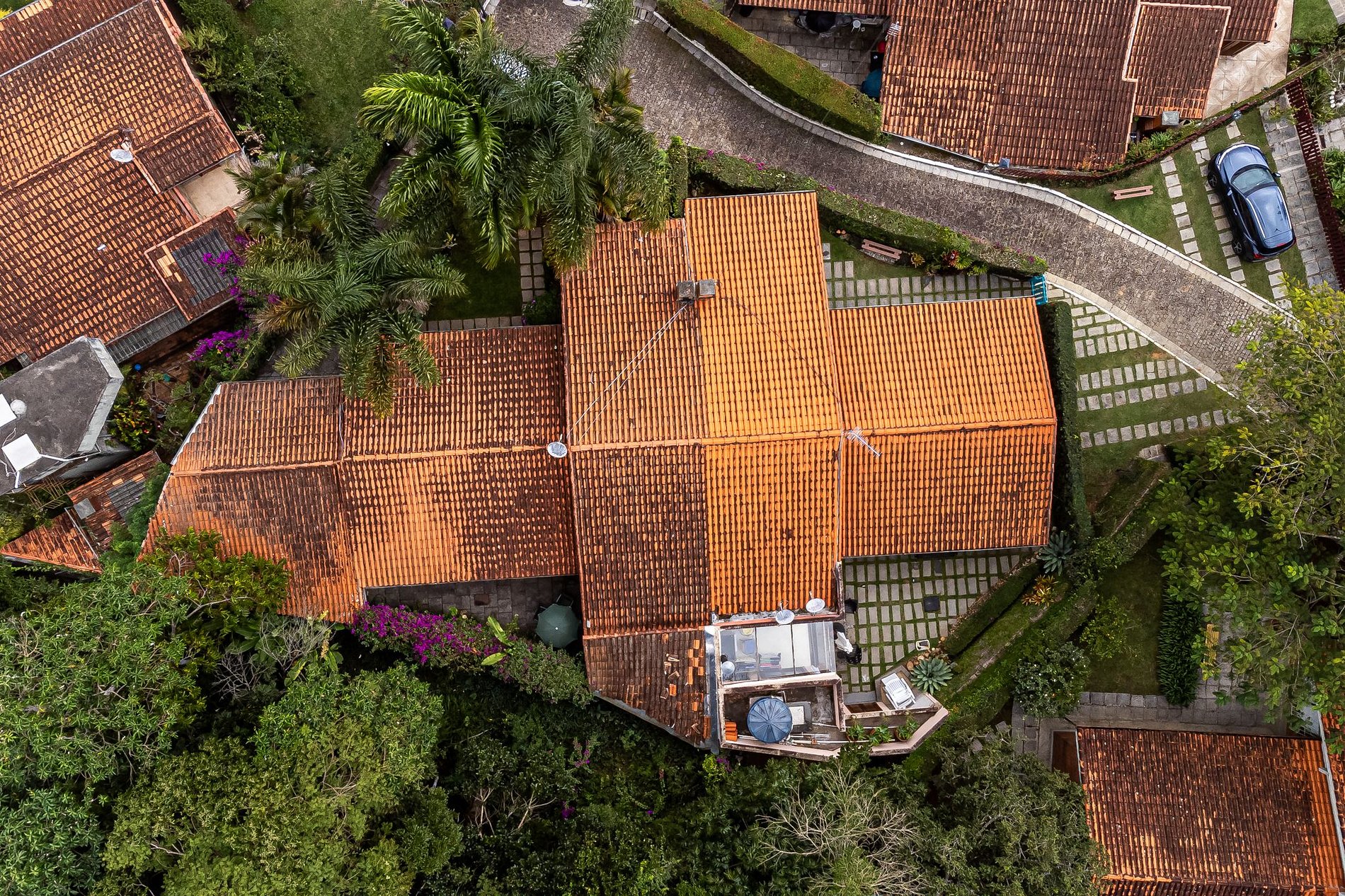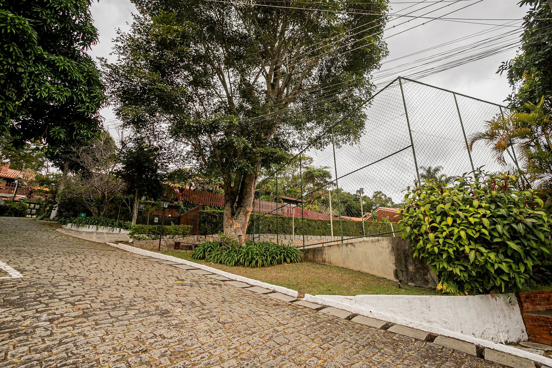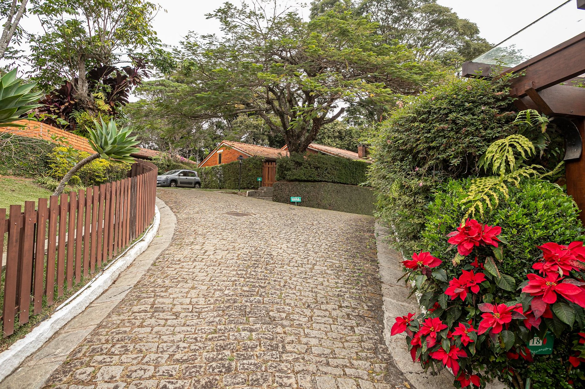 Os caminhos de pedra, as árvores frondosas e o cuidado com cada detalhe criam um cenário acolhedor e elegante. Um convite constante para passeios tranquilos, descanso sob as sombras e momentos de conexão com a natureza.