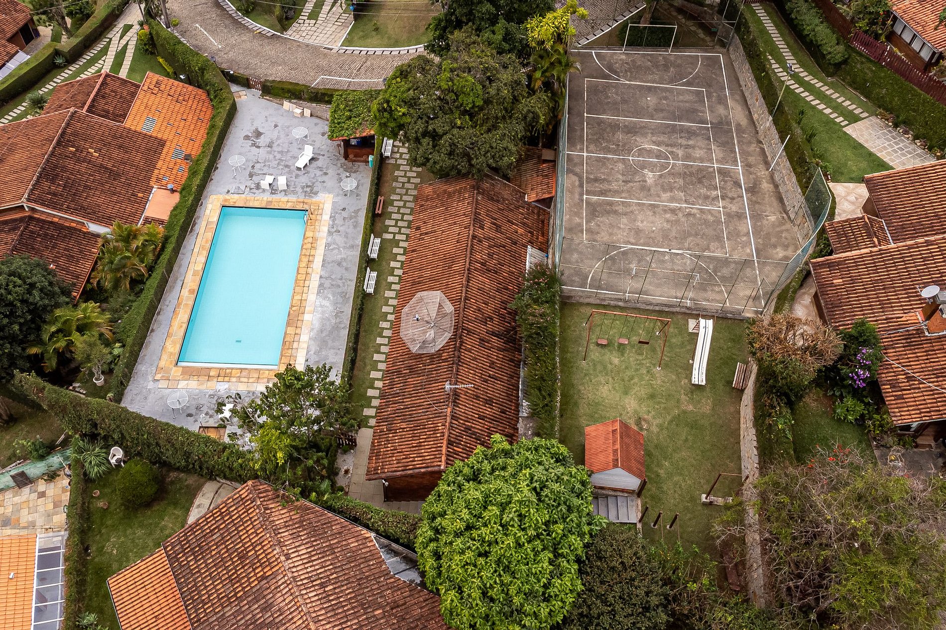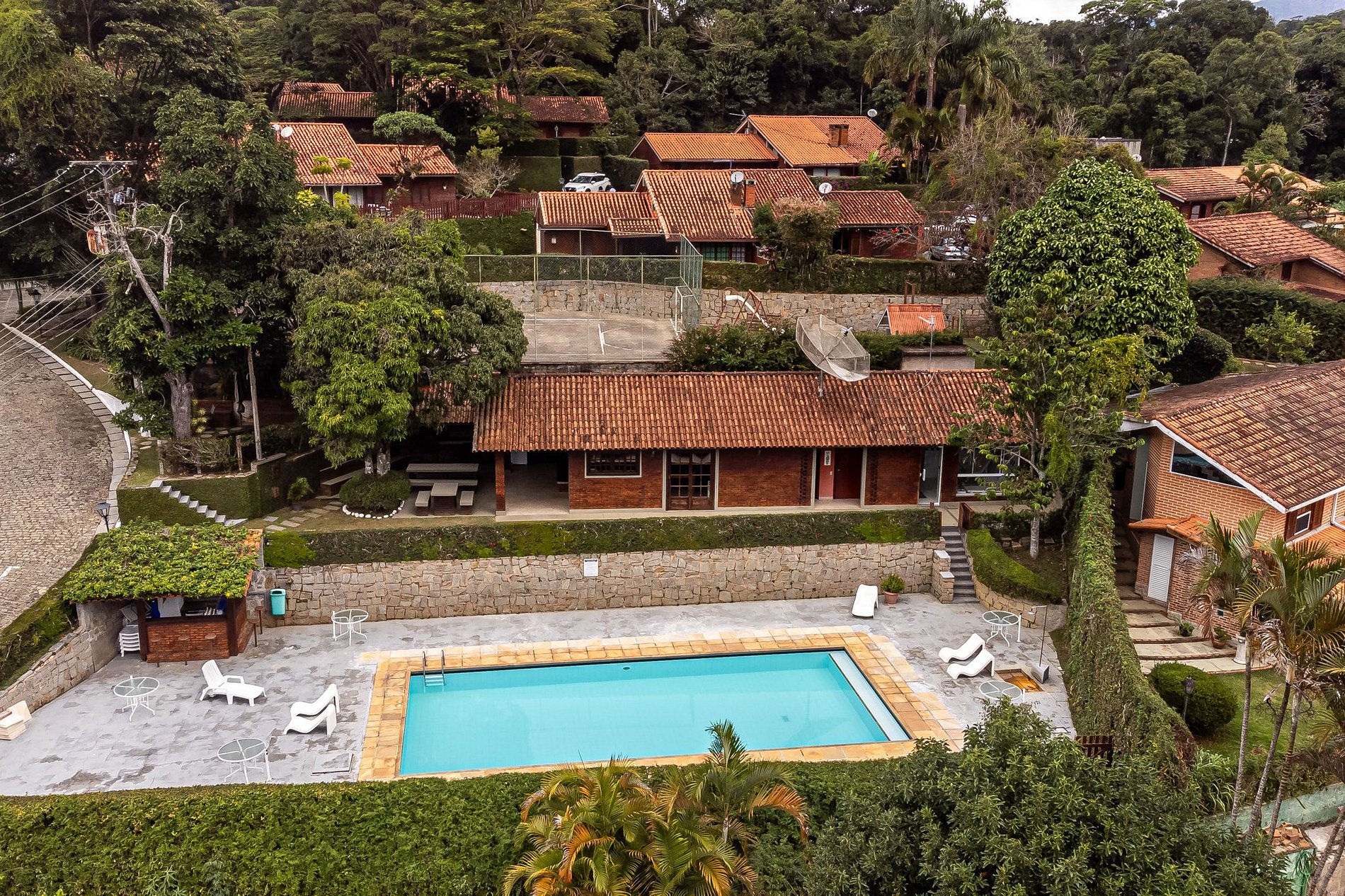 A quadra poliesportiva — cercada por muros de pedra, alambrado e uma vista arrebatadora das montanhas — é o espaço perfeito para partidas em família: futebol, vôlei ou basquete, sempre com o frescor da serra e o som do vento entre as árvores.