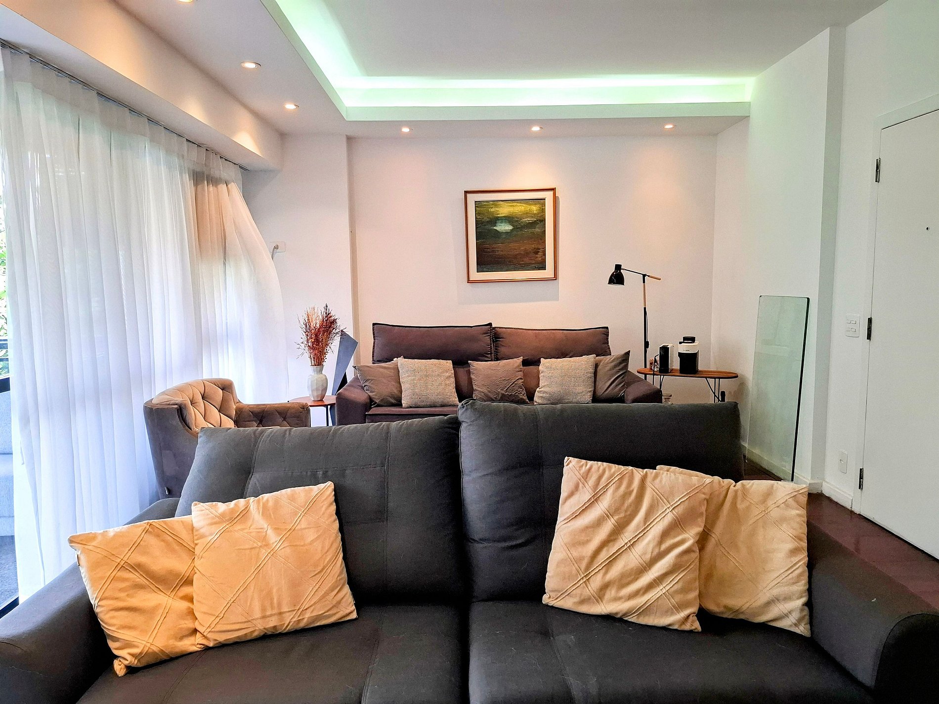 A sala é perfeita para maratonar séries na TV de tela plana ou postar suas fotos com o Wi-Fi rápido. A cozinha? Completinha! Tem geladeira, fogão, forno, micro-ondas, cafeteira, liquidificador e utensílios para do café da manhã ao jantar digno de chef.