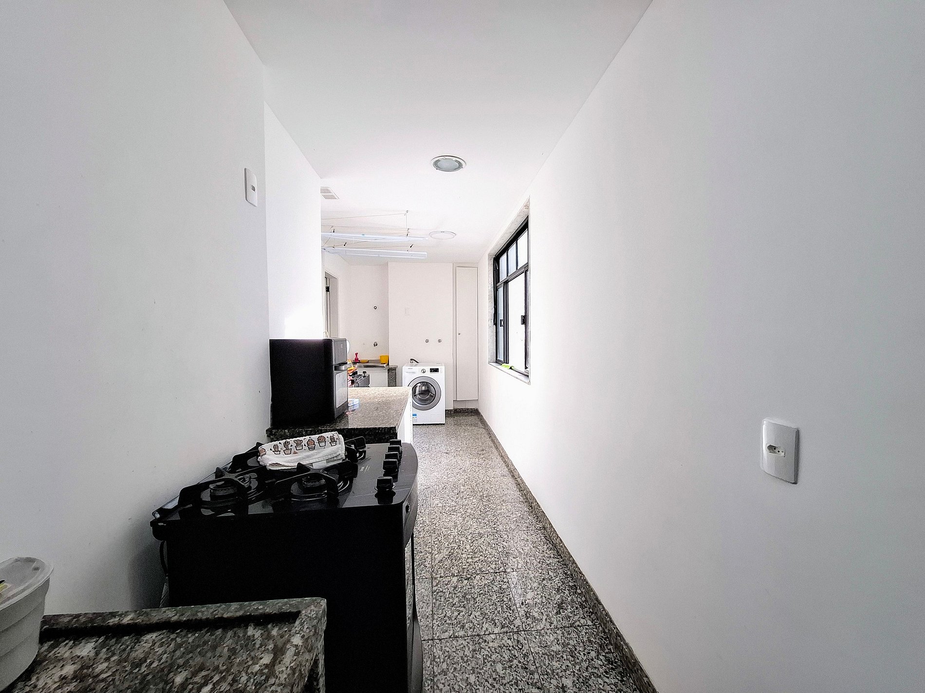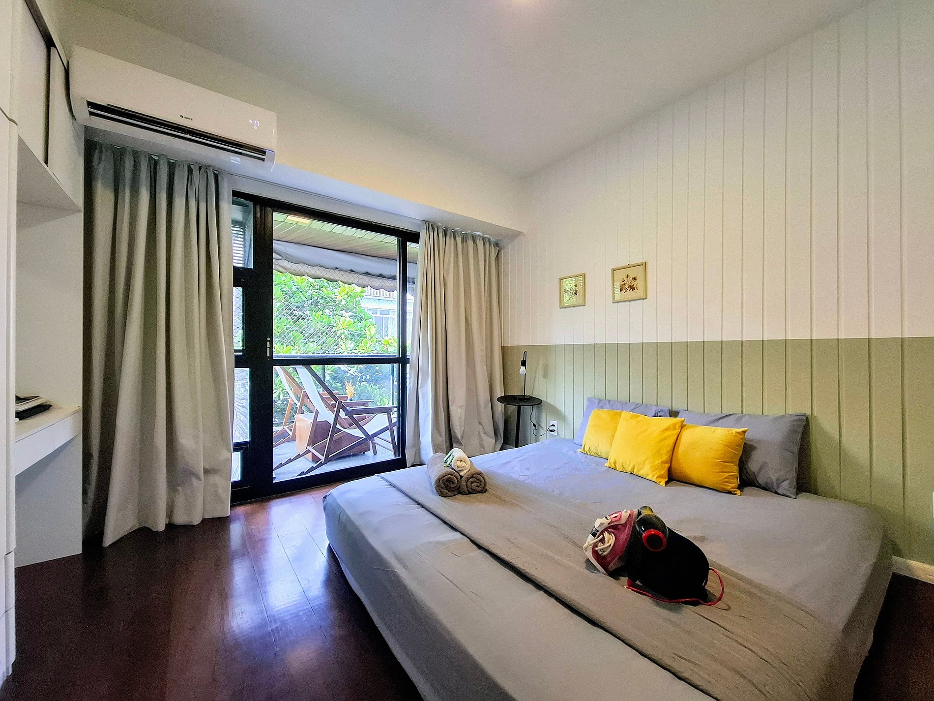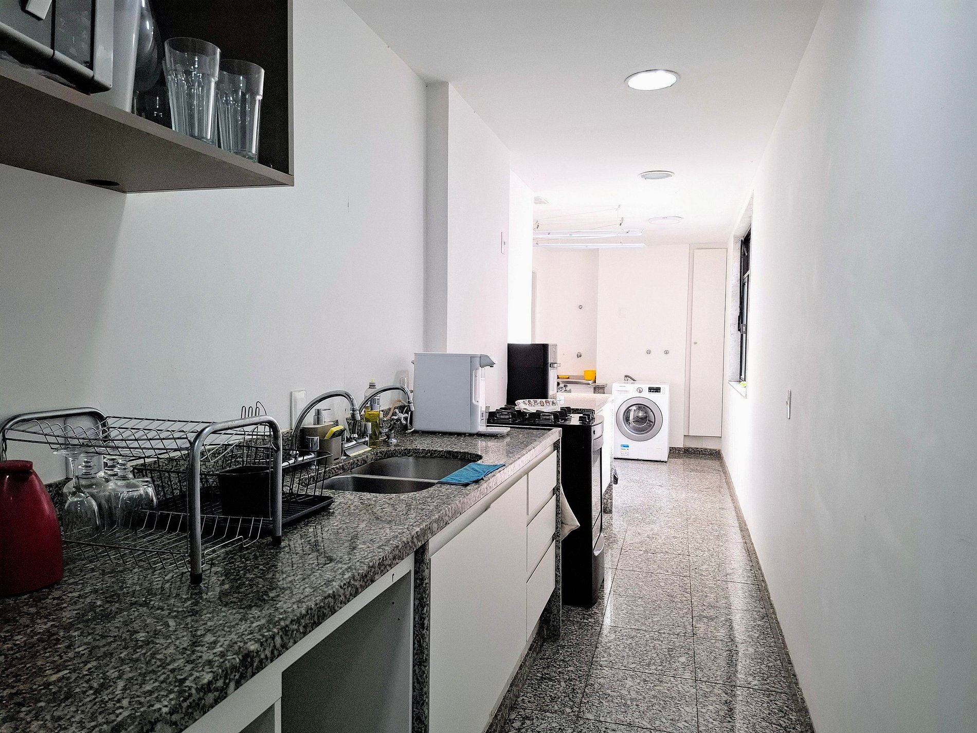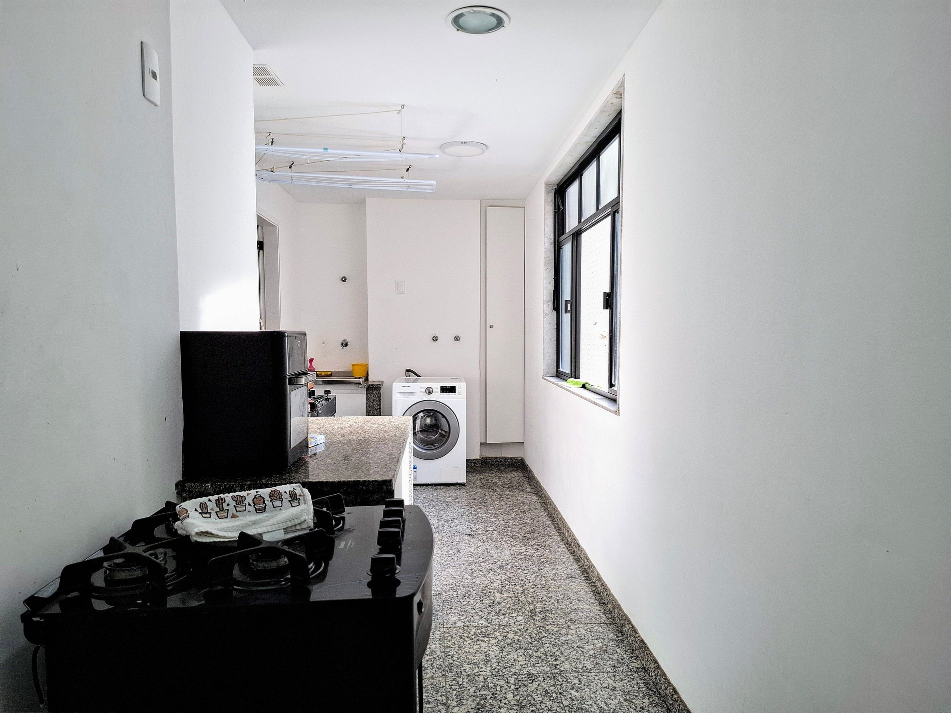 O prédio residencial conta com elevador e vizinhança tranquila. O interior é bem iluminado e decorado com toques modernos: suíte com cama king e enxoval macio, quarto extra com estação de trabalho, sala integrada com TV de tela plana e varanda com vista verde. Cozinha equipada e área de serviço com máquina de lavar completam a experiência. Ao redor, supermercados, farmácias e transporte público estão a poucos passos.