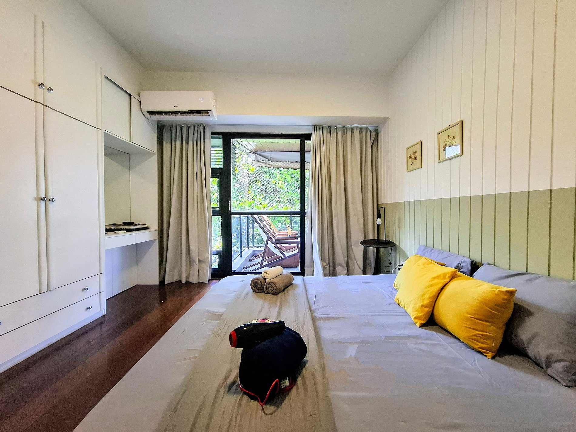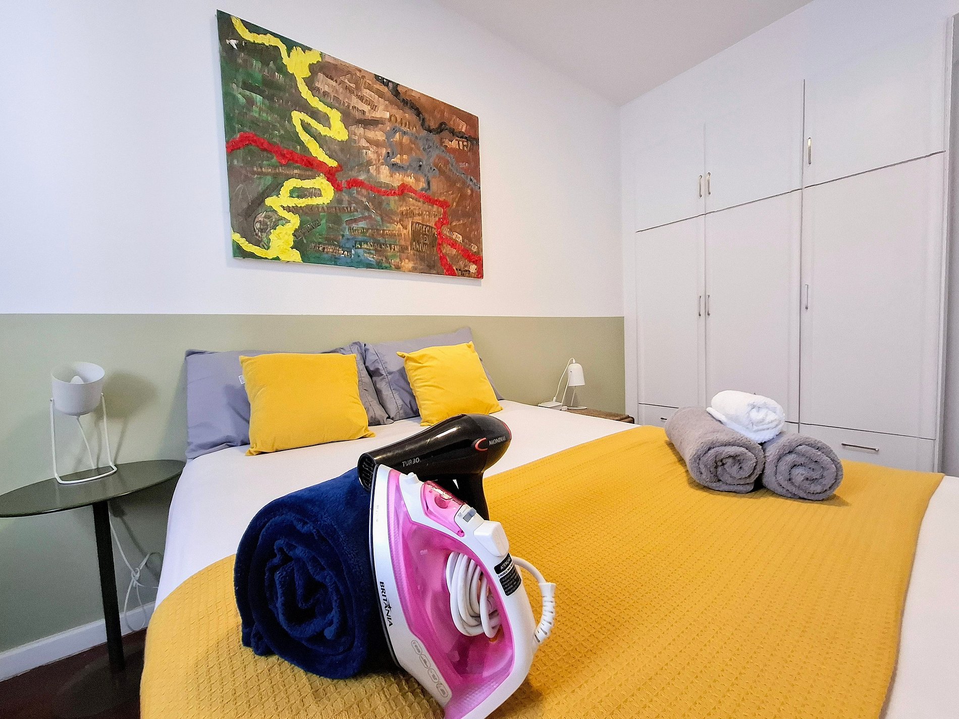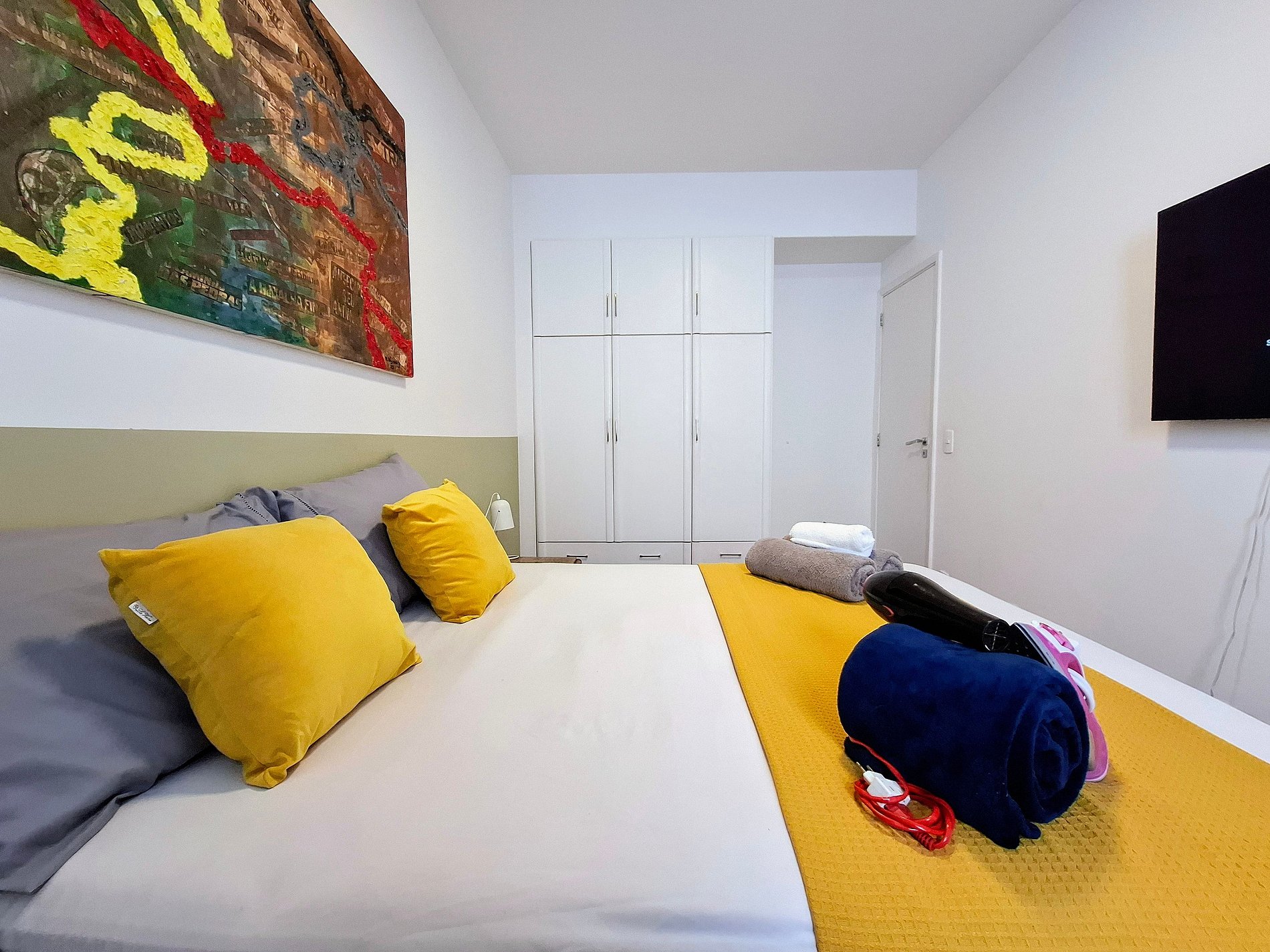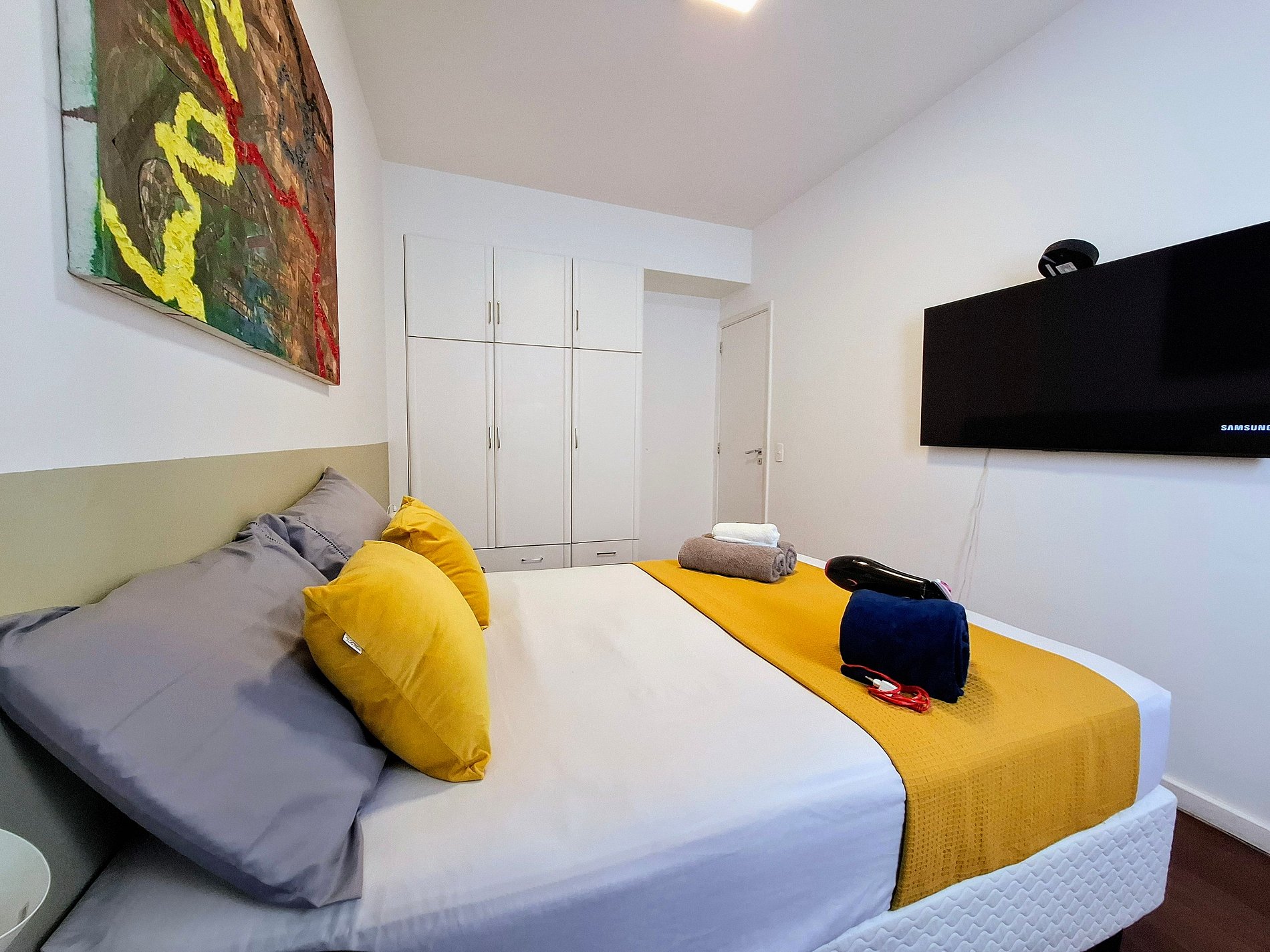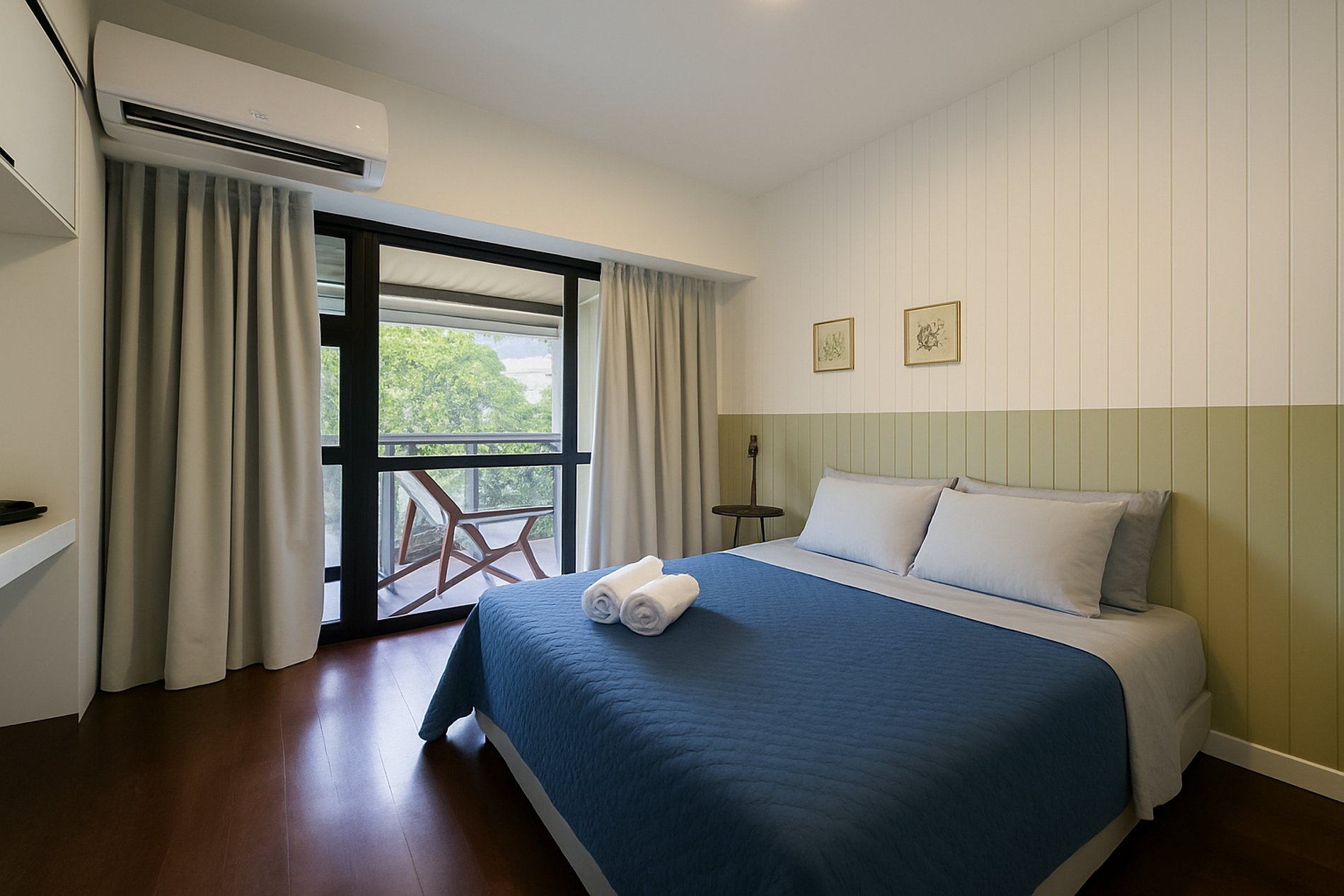 O prédio residencial conta com elevador e vizinhança tranquila. O interior é bem iluminado e decorado com toques modernos: suíte com cama king e enxoval macio, quarto extra com estação de trabalho, sala integrada com TV de tela plana e varanda com vista verde. Cozinha equipada e área de serviço com máquina de lavar completam a experiência. Ao redor, supermercados, farmácias e transporte público estão a poucos passos.