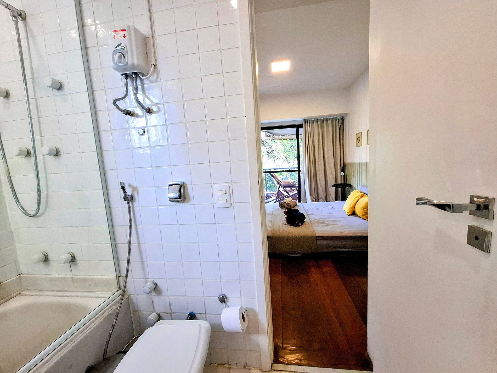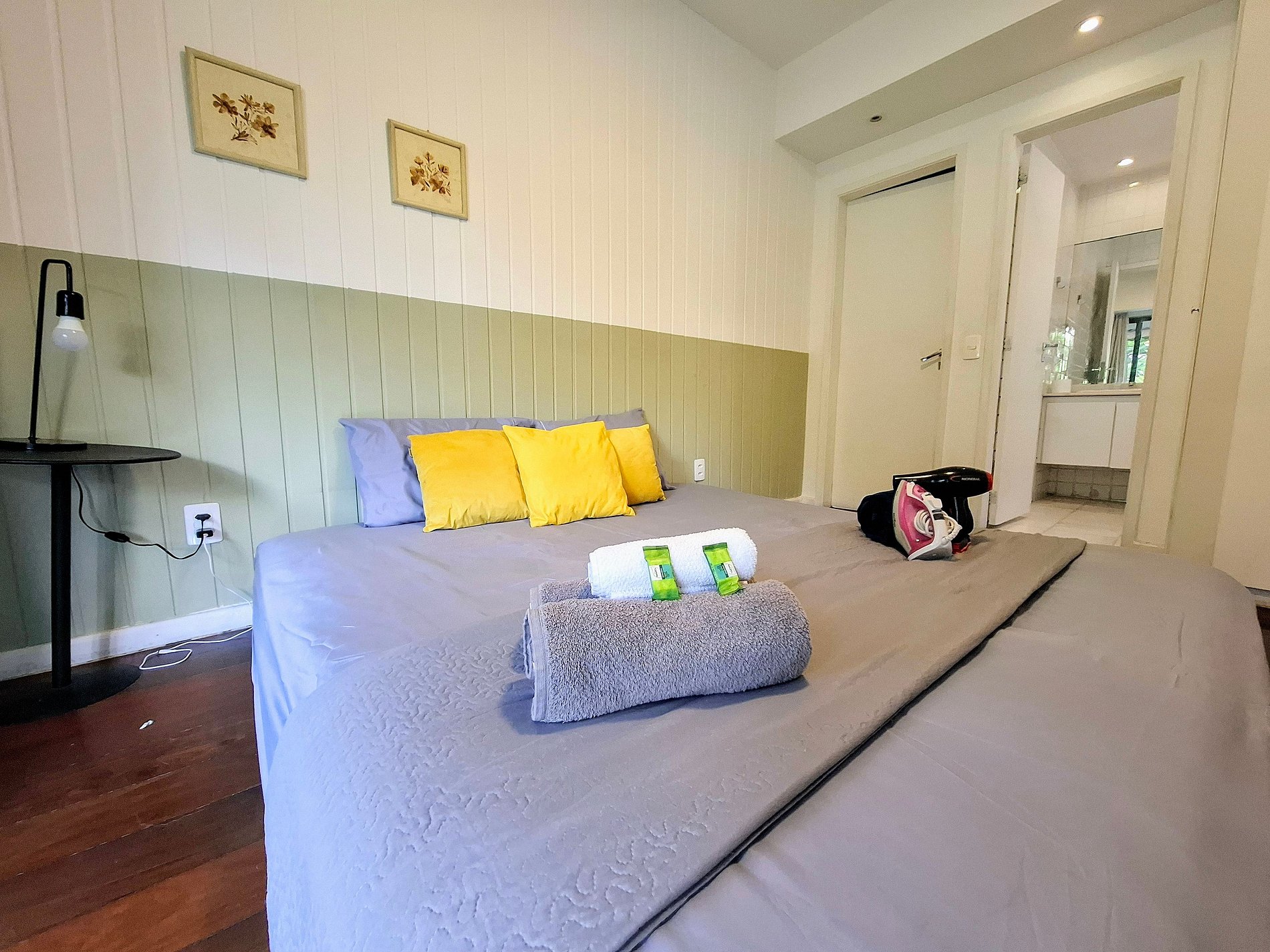 Dois banheiros com água quente a gás e ducha higiênica, varanda para curtir o café da tarde ou um vinho ao pôr do sol, fechadura eletrônica para entrar sem drama e enxoval macio de cama e banho já incluído. Ficou mais tempo? A cada 7 dias a gente troca tudo pra você. E para famílias, berço e caminha de bebê estão disponíveis — é só avisar antes!